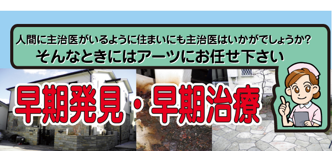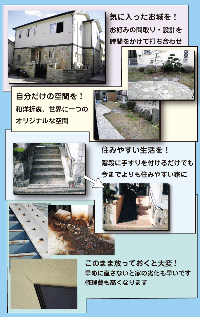 どんな悩みがありますか? ページトップへ 施工事例 アプローチ 目隠しフェンス 防草シートと玉砂利 サンルーム 大規模修繕工事 自動車ミラー 駐車場カラークリート 玄関からの手摺 外の水道栓 ジョリパット仕上げ 早期発見、早期治療