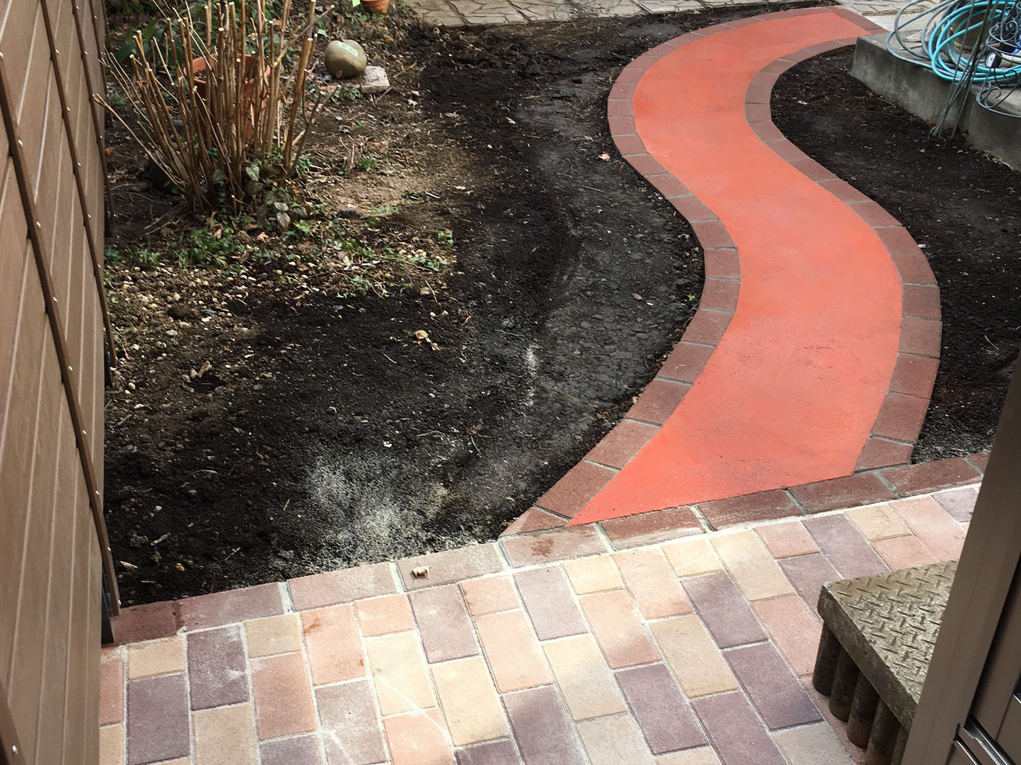駐車場から庭へのアプローチ ※マウスを画像に近づけると施工前の写真が現れます。 レンガで縁取りし、カラークリートで安価に仕上げています。出来上がりは鮮やかすぎますが、だんだん色が落ち着いてきます。 ページトップへ 施工事例 アプローチ 目隠しフェンス 防草シートと玉砂利 サンルーム 大規模修繕工事 自動車ミラー 駐車場カラークリート 玄関からの手摺 外の水道栓 ジョリパット仕上げ 早期発見、早期治療