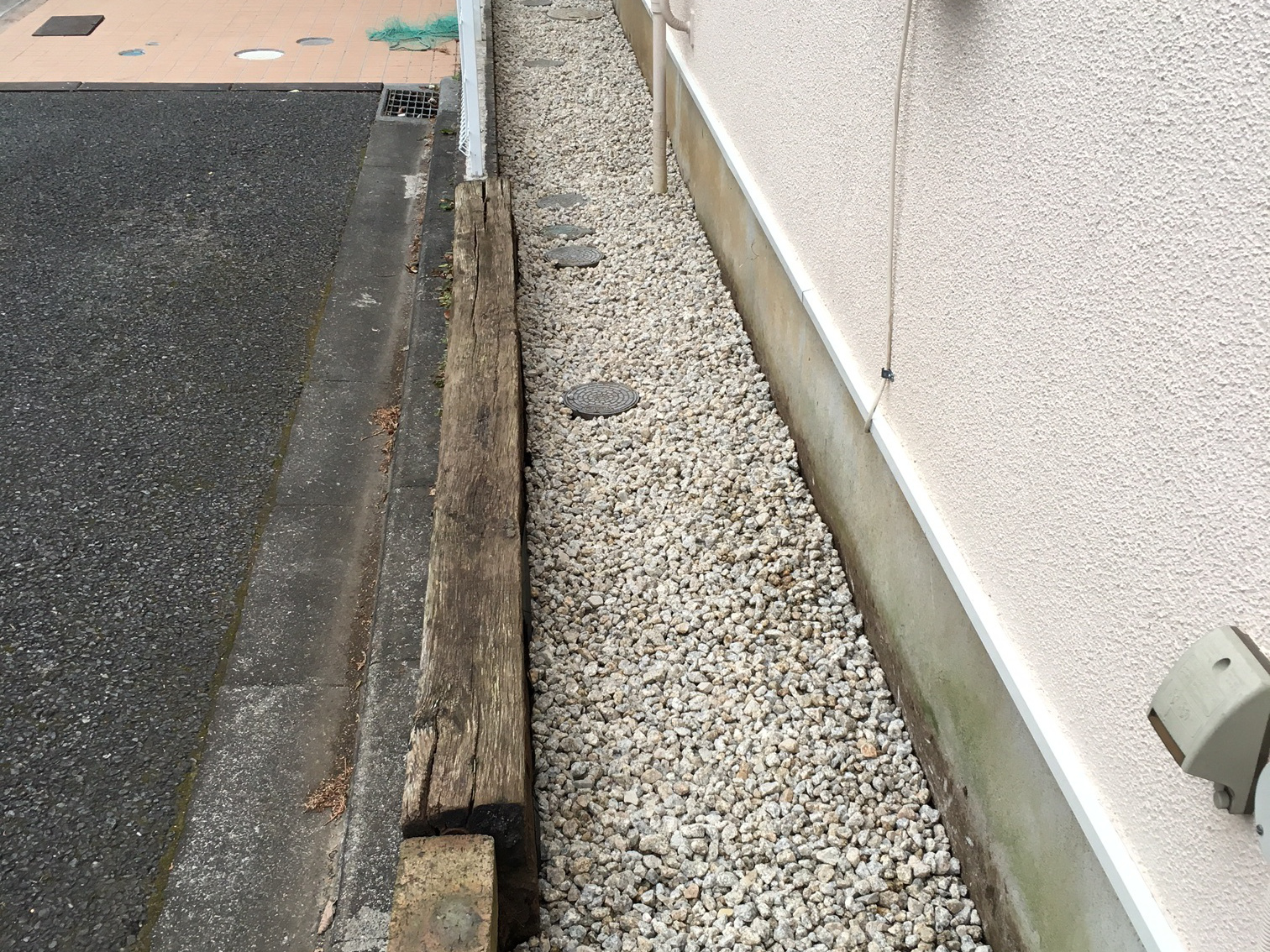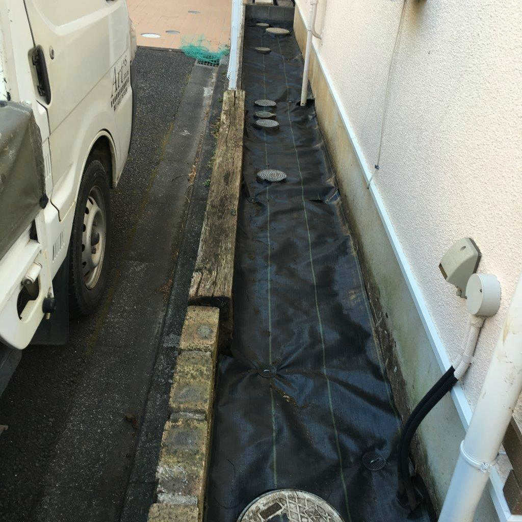 防草シートと玉砂利 ※マウスを画像に近づけると防草シートの写真が現れます。 以前は雑草がびっしり生えていました。狭い通路なので除草が大変でした。又、玉砂利の上を歩くと音がするので防犯にも最適です。 ページトップへ 施工事例 アプローチ 目隠しフェンス 防草シートと玉砂利 サンルーム 大規模修繕工事 自動車ミラー 駐車場カラークリート 玄関からの手摺 外の水道栓 ジョリパット仕上げ 早期発見、早期治療